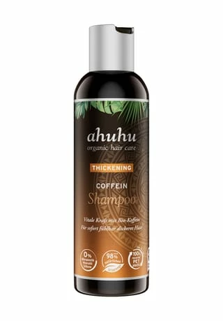 Das ahuhu THICKENING Coffein Shampoo aus dem Hause asambeauty mit stimulierendem Bio-Koffein reaktiviert die Haarwurzeln und lässt dünnes und lichter werdendes Haar fühlbar dicker und kraftvoller wirken.